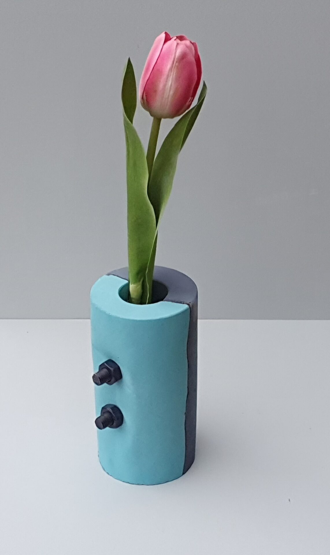Blomvas i betong. Modell med 2 stycken M10 skruvar. Storlek höjd 15 cm och diameter 8 cm. Helt tät (ingjutet provrör i glas). Tillverkas i 24 exemplar. Finns i lite olika färger. Se bilderna.